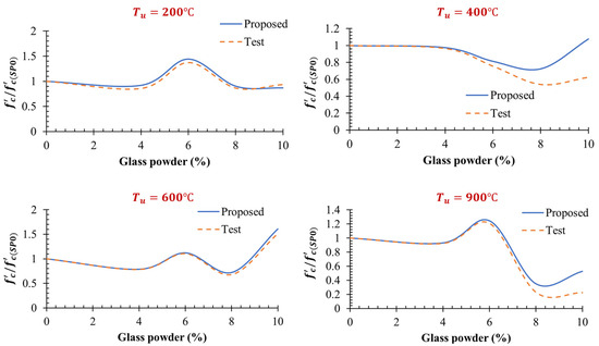 To predict the of the specimen under different , the following equations are proposed. According to the equations, first, the is calculated, and then its relation to the glass power (GP) ratio at different is calculated. The proposed equations exhibit good agreement with the test results, with the maximum error being less than 2%. In these equations, GP represents the glass powder. The results obtained from Equation (6a–d) are compared with the test results in Figure 13.