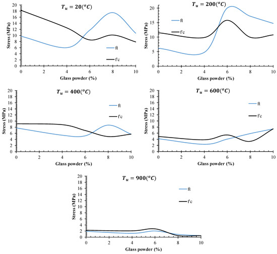 - With the exception of models under Tu = 200 °C, temperature reduced the tensile strength of specimens. Models with 4% glass powder exhibited the minimum tensile strength for all evaluated temperatures.