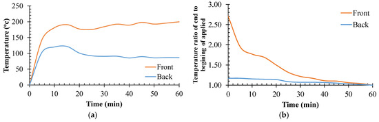 In Figure 16, the temperature profiles at the front (direct fire) and back of the block are presented. As expected, the heat at the front of the block was higher than at the back. Notably, a significant finding is that the temperature at the back of the block was reduced by a substantial margin, ranging from 28% to 57%. Towards the end of the applied fire (time = 58 min), the temperature at the front was 2.71 times the initial value (time = 5 min), while the ratio for the back of the block was approximately 1.17 times the initial value. The presence of two voids created by the middle layer of the block contributed to this favorable performance against heat transmission.
