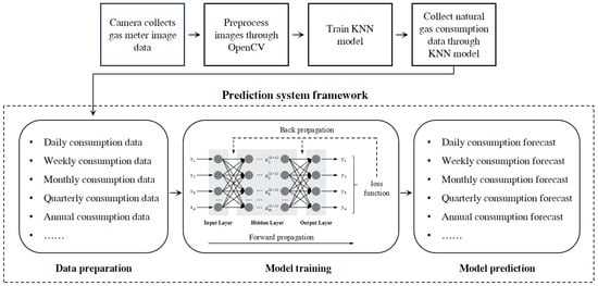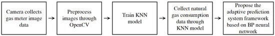 Owing to the limited scope of natural gas company records, the high cost of natural gas consumption monitoring devices, safety hazards associated with the installation of these devices, and the inefficiency of manual meter reading, monitoring natural gas consumption at the household level is challenging []. Therefore, this study proposes a KNN-based monitoring method. This method involves training an image recognition model capable of identifying residential natural gas meters by inputting meter images. An adaptive prediction system framework is introduced based on the monitored data. The overall methodology of this study is shown in Figure 1.
