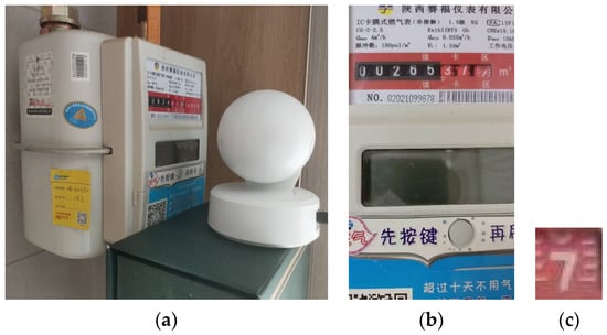 Experimental equipment and images: (a) CG-Z-2.5 IC card membrane gas meter and camera; (b) Image captured by the camera; (c) Image of an individual grid digit.
