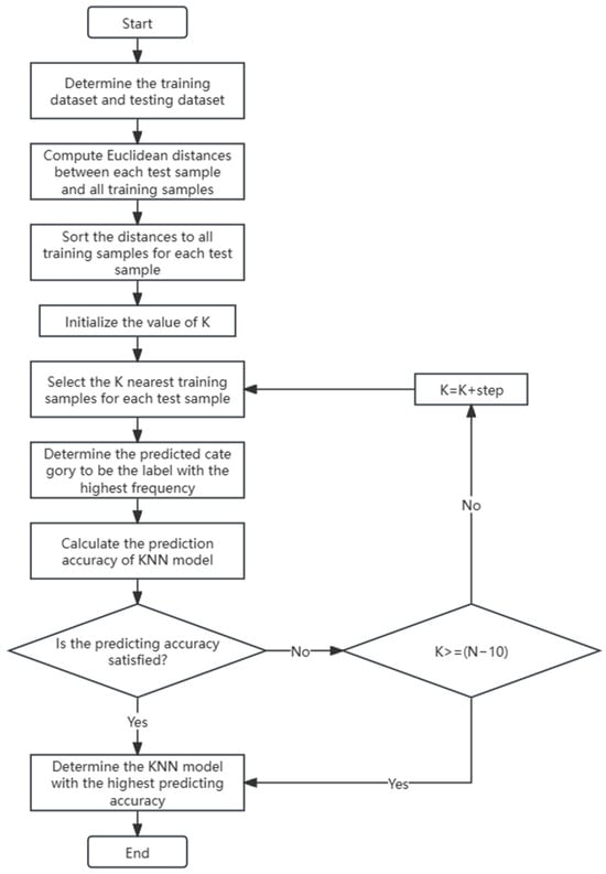 - Check whether the prediction accuracy of the model satisfies the requirements. If satisfied, the KNN model training is complete. Otherwise, increase the K value and return to Step 3. In this study, the step size for increasing K was set to 1. If K becomes greater than or equal to the number of samples (N) in the training dataset minus 10, the training ends, and the KNN model with the highest prediction accuracy is the output.