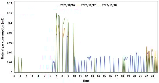 From Figure 5, it is evident that from 0:00 to 6:00 on 16 October, no natural gas consumption occurred, which is attributed to sleeping hours. The period from 6:00 to 9:00 experienced higher consumption every 5 min due to activities such as washing, bathing, cooking, and dish washing, reaching its peak for the day. From 10:00 to 24:00, frequent gas consumption occurred owing to the regular hot water supply and other factors. Notably, sustained consumption was observed at 12:00–13:00 and 18:00–19:00, corresponding to lunch and dinner, respectively. The increased gas consumption at approximately 22:00–23:00 can be attributed to activities such as washing.