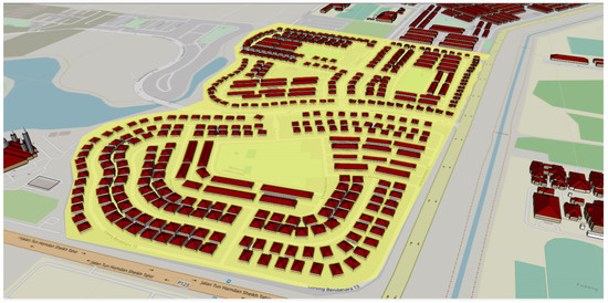 The residential area in Bertam City was determined to cover an expanse of 0.364 km2. The areas highlighted in red in Figure 2 show the residential models in the digital twin city. There are approximately 2464 house models that were generated by the software. The building models described as single-family pertain to dwelling units constructed on individual lots, whereas multi-family denotes residential properties with more than one housing unit. In this research, simulations were conducted for both types of residential housing models to determine their energy usage and carbon emissions.