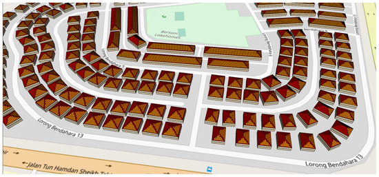 Following the successful evaluation of HVAC system upgrades, the research investigated the potential for solar roof utilization in Bertam City’s residential areas. Leveraging the capabilities of the iCL-iCD v.2021.1 simulation software, the study aimed to calculate attainable energy gains and carbon offsets through the installation of rooftop solar photovoltaic (PV) panels. However, due to technological limitations at the time of the study, applying solar PV roof panels to all 2464 building models available in the virtual city proved infeasible. The application would only be possible with the use of higher-performance computer devices, which was not possible at the time of this study. To overcome this constraint, a small residential section in Bertam covering an area of 0.324 km2 was chosen as a case study. Bertam Lakehomes consists of 371 single-family and 52 multi-family model houses. This is depicted through the highlighted area in Figure 3. Figure 4 shows the solar PV panel generation on the roofs of Bertam Lakehomes.