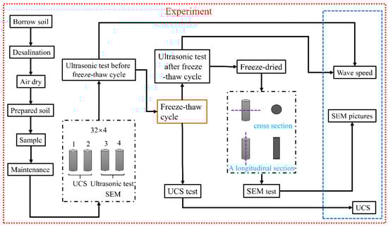 The salt contents of the test settings are 0%, 0.5%, 1%, and 2%, and the numbers of freeze–thaw cycles are 0, 1, 3, 5, 10, 20, 30, and 50 times, respectively, with a total of 32 test types. Each type contains 4 soil samples for parallel testing, totaling 128 soil samples. Among them, a set of UCS parallel tests was completed on two mechanical test soil samples that were in a melted state after undergoing freeze–thaw cycle tests. The other two wave speed test soil samples were subjected to a parallel wave speed test before the start of the freeze–thaw cycle test, which is called the wave speed test before freezing and thawing (compressional wave and shear wave speed test before freezing and thawing). After the target number of freezing and thawing cycles is completed, wait for it to appear in a melted state and then conduct a parallel wave speed test, which is called the wave speed test after freezing and thawing (compressional wave and shear wave speed test after freezing and thawing). Finally, after the wave speed test is completed, it is freeze-dried and subjected to two sets of (cross-section, longitudinal section) SEM parallel tests.