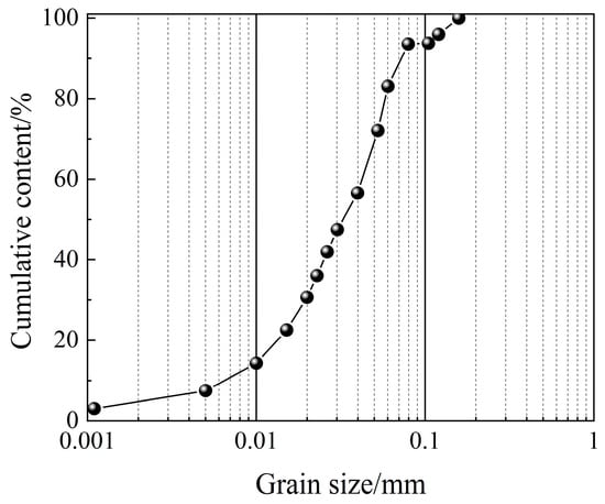 The test soil was obtained from Lanzhou, China. After soil is collected, desalination is carried out first. The specific process refers to the desalination treatment of loess-like saline soil provided by Hui Bing et al. []. After desalination, air-dry and pass through a 2 mm sieve for later use. The soil ion content before and after desalination is shown in Table 2, which meets the relevant test requirements [,]. The particle size distribution and basic physical properties of the soil samples after desalination are shown in Figure 2 and Table 3, respectively. The test soil sample is silty clay (ASTM D2487-17 (2020) []).