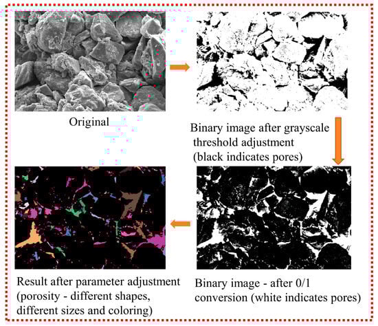 Through the above SEM test, SEM photos of the same observation point and different magnifications of the sample to be tested can be obtained. The acquisition of SEM characteristic parameters will use PCAS software (Particles (Pores) and Cracks Analysis System (PCAS) V2.3) []. It was jointly developed by Dr. Liu Chun and his team from the School of Earth Science and Engineering of Nanjing University. It is a piece of software that specializes in automatic identification, geometric quantification, and statistical analysis of rock and soil particles, pores, and crack images. The specific process is shown in Figure 3. According to relevant information [,,] and preliminary tests, the relevant threshold parameters are determined as follows: threshold: 75; element radius (pixel) 2.1; minimum area (pixel) 50.