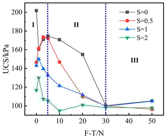 As shown in Figure 4, UCS shows obvious stages of characteristics change as the number of freeze–thaw cycles increases. Taking N = 5 and 30 as the node, it is divided into three stages. According to the changes in each stage, the first, second, and third stages are named adjustment period, dynamic fluctuation period, and stable period.