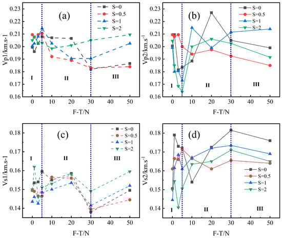 The relationship between controlling factors and soil wave speed: (a) compressional wave speed before freeze–thaw cycle; (b) compressional wave speed after freeze–thaw cycle; (c) shear wave speed before freeze–thaw cycle; (d) shear wave speed after freeze–thaw cycle wave speed. Among them, I, II, and III represent the first, second, and third stages respectively; the blue dotted line is the stage dividing line.