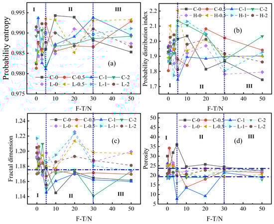 As shown in Figure 6, the four parameters of probability entropy, probability distribution index, fractal dimension, and porosity all show obvious stages of characteristics change with the increase in the number of freeze–thaw cycles. Taking N = 5 and30 as the node, it can still be divided into three stages, which still correspond to the adjustment period, the dynamic fluctuation period, and the stable period.