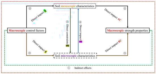 The three-level characteristic interaction hypothesis is shown in Figure 8. The macro control factors (control variables in this study) affect the macro strength characteristic—UCS changes. However, this is not a direct effect, i.e., path ①, an inter-mediate path. The middle path is divided into two parts: paths ② and ③. Between them, the macro control factors in path ② directly affect the meso properties of the soil first, such as causing crack development and defect derivation at the meso scale (between the centimeter scale of the macro test and the micron scale of the micro analysis), thus affecting the macro UCS of the soil. The macro control factors in path ③ directly affect the micro properties of the soil, such as causing the soil particles on the micron scale inside the soil to become broken and denuded and the pores to expand or shrink, thereby affecting the macro UCS of the soil. It is worth noting that paths ② and ③ are not independent, and the micro properties of the soil directly affect the meso properties of the soil, i.e., path ④. At the same time, the meso characteristics restrict the further development of the micro characteristics to a certain extent, i.e., path ⑤, forming a complex dynamic equilibrium interaction system as a whole.