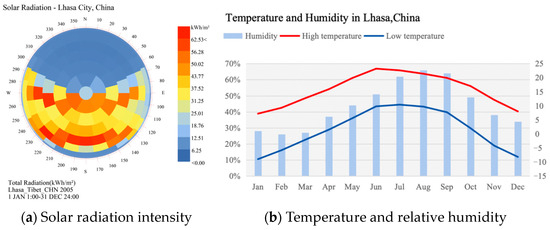 Lhasa is located on the southwestern border of China. According to the Köppen climate zone (Figure 1), Lhasa has a warm summer and a dry, cold winter (Dwb) [26] and is characterized by thin air, distinct dry and rainy seasons, low temperatures with small annual differences and large daily differences, and the precipitation is low throughout the year, and it is concentrated in July and August and mostly at night. Lhasa City has strong solar radiation and long sunshine hours. The annual sunshine hours can reach more than 3000 h, providing very rich solar energy resources (Figure 2) [27].