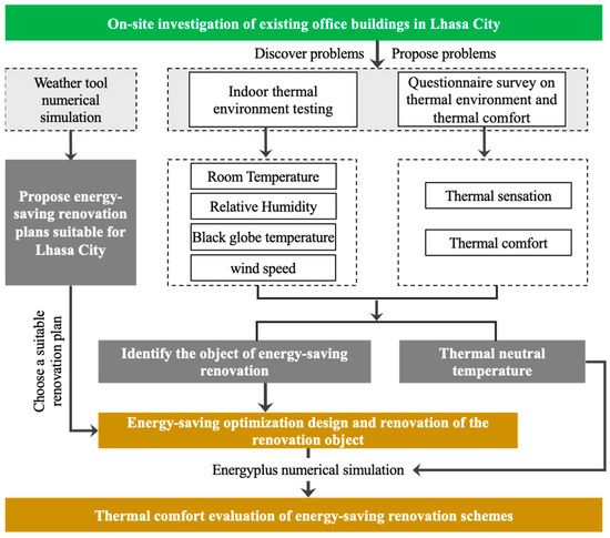 The research framework of this study is shown in Figure 3. In the first step, the current characteristics and heating forms of existing office buildings in Lhasa are understood through field research. In the second step, three typical office buildings in Lhasa are selected to evaluate the current status of the indoor thermal environment and thermal comfort characteristics through questionnaire surveys combined with thermal environment tests and to identify energy-saving renovation objects. At the same time, the demands of the local office workers for thermal comfort are clarified, and the indoor thermal neutral temperature is determined, which provides a basis for setting boundary conditions in the subsequent numerical simulation. The third step is to simulate the changes in the comfort zone of different passive energy-saving solutions in Lhasa through the Weather Tool (vision 3.0) simulation software to determine the appropriate local passive building design strategies and then propose the appropriate energy-saving potential of the envelope of office buildings for the Lhasa area. Based on this, we propose a suitable energy-saving potential excavation point and thermal optimization strategy for office buildings in the Lhasa area. In the fourth step, we carry out the energy-saving renovation of the enclosure structure of the renovation object and comprehensively evaluate the energy-saving renovation plan with the goal of improving indoor thermal comfort to verify the feasibility of the energy-saving renovation strategy.