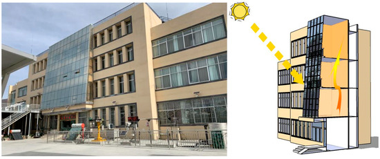 Based on the results of field research and questionnaire interviews, it is concluded that among the three typical buildings, mainly building D has problems with the two aspects of enclosure structure and thermal comfort. So, this study selects building D as the object of energy-saving optimization and renovation. This office building is a single corridor type, with a height of four floors; the building heating method is an additional sunroom, the main entrance of the building faces south, the south side mainly contains offices, and the stairwell is in the north part of the building. In order to capture more sunlight, a south-facing glass curtain wall was constructed from the second floor to the fourth floor, and the glass curtain wall had a certain tilt (Figure 4). However, the problem is that there is no separation between each floor and the glass curtain wall. It was found that the room temperature of the office has a large temperature difference between day and night, and this difference is far greater than the thermal comfort range of the human body in office buildings in Lhasa City. In addition, the glass curtain wall has a small number of openings and a small area, causing serious ventilation deficiencies and a stuffy indoor space in summer.