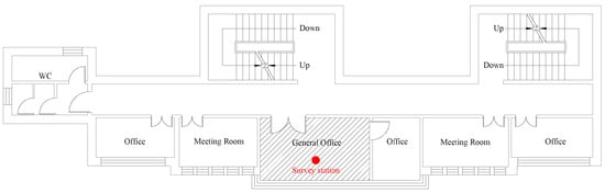 As illustrated in Figure 5, for building D of the standard floor plan, for the third floor, the fourth floor on the south side to the middle of the office, a measurement point was set up, and a control GSP-958 automatic temperature and humidity recorder and WFWZY-1 universal wind speed and wind temperature recorder were deployed to test the changes in the thermal environment parameters of the selected room.
