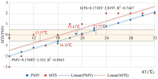 In this paper, the room temperature, as an important indicator of the indoor thermal comfort level, is used as the independent variable, and the mean of the actual thermal sensation vote (MTS) and the mean of the predicted thermal sensation (PMV) of the subjects are used as the dependent variables. The linear regression analyses are performed using the SPSS 26.0 statistical analysis software. The results are shown in Figure 6.