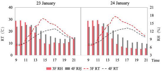 To further characterize the indoor thermal environment of building D, which is the object of our energy-saving renovation, due to the cold climate in Lhasa, the number of window openings for air exchange in the test office is not high, and the window opening area is very small. Hence, the indoor wind speed is very small and tends to be close to zero. In addition, the average ambient radiant temperature in winter is roughly equal to the average indoor temperature in terms of numerical value, so the study takes the air temperature and relative humidity as the main indicators to analyze [38].