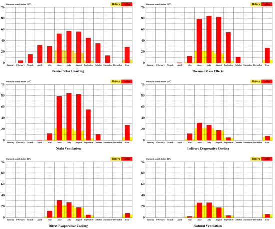 The effect of various passive measures on the thermal comfort of the building is shown in Figure 8. The yellow column indicates the percentage of thermal comfort before the adoption of the relevant technology, and the red column indicates the percentage of thermal comfort after the modification with the relevant technology. From the figure, it can be seen that the passive measures applicable to the local climate of Lhasa City are prioritized as passive solar energy (a), high heat capacity materials (b), and night ventilation (c). The use of passive solar energy and other means to increase the heat gain of the building, the use of high heat capacity materials to increase the heat storage capacity of the enclosure structure and thus reduce heat loss, and the night ventilation can ensure the indoor temperature during the day and increase indoor air circulation, which can improve the thermal comfort of the office space to a large extent.