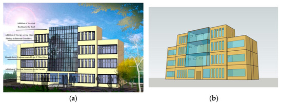 Schematic diagram of the office building renovation program. (a) Rendering of the renovated office building. (b) Simplified model of the office building.