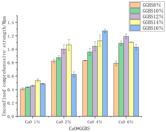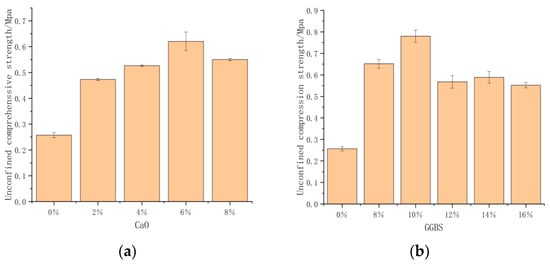 Figure 4a,b, it can be observed that for both curing agents, namely calcium oxide and blast furnace slag, which were maintained for only 7 days, the compressive strength of specimens composed of calcium oxide and blast furnace slag increased with an increase in their mixing amount. However, after reaching a certain mixing amount, the compressive strength began to decrease. The highest recorded compressive strength was 0.610 MPa when the content of calcium oxide was 6%, while it reached its peak at 0.780 MPa when the content of blast furnace slag was 10%. In comparison to plain soil’s compressive strength of 0.257 MPa, the addition of these two curing agents individually resulted in an increase in plain soil’s compressive strength by approximately 137% and 204%, respectively.