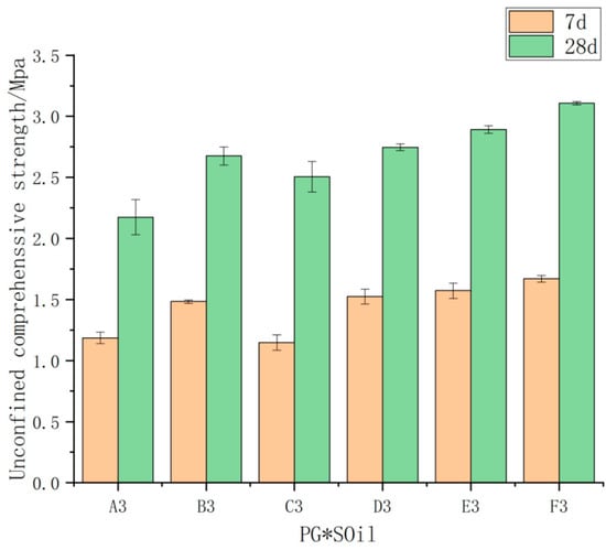 26]. When there is a high content of phosphogypsum present, it no longer functions solely as an additive but also becomes part of the solidified soil structure. Compared to soil particles themselves, phosphogypsum has a smaller particle size, which gradually increases sanding within the soil matrix, leading to increased pore volume and stabilization in structure.