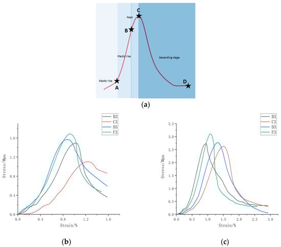 Figure 7b,c, respectively. It can be observed from figure that the stress–strain diagram exhibits four distinct stages, namely elastic rising stage, plastic rising stage, limit stage, and falling stage [