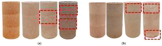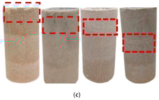 The aforementioned situation arose due to the repeated soaking and evaporation of water in the sample during the dry–wet cycle, resulting in a disparity in water content between the interior and exterior of the sample. This discrepancy induced tensile stress on the surface of the sample. When there was insufficient cementation among particles within the sample to withstand this tensile stress, voids appeared on its surface. As the cycles progressed, these voids expanded further, leading to the structural degradation of soil and subsequent strength decline. It should be noted that as cycles increased, strength gradually decreased or even exhibited slight improvement. This can be attributed to residual water within the sample after soaking, which promotes hydration reactions during drying processes, thereby increasing hydration products and enhancing internal cementation capacity. Throughout this process, particle bonding became sufficient to resist tensile stresses caused by disparities in the moisture content and strength between both sides of the specimen.
