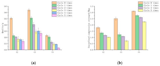 Figure 9a, the mass change in the three test blocks after undergoing dry–wet cycles is presented. It can be observed that with an increasing number of cycles, the quality of E2 and C3 test blocks experiences a sharp decline after the first cycle, while the quality of F3 test block decreases more gradually. After five dry and wet cycles, the mass reduction percentages for E2, C3, and F3 test blocks were recorded as 5.52%, 5.48%, and 3.11%, respectively. Notably, both E2 and C3 blocks lose an additional 2% in mass compared to F3 blocks.