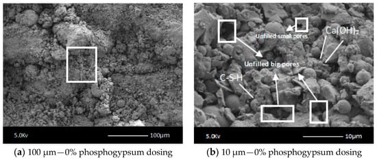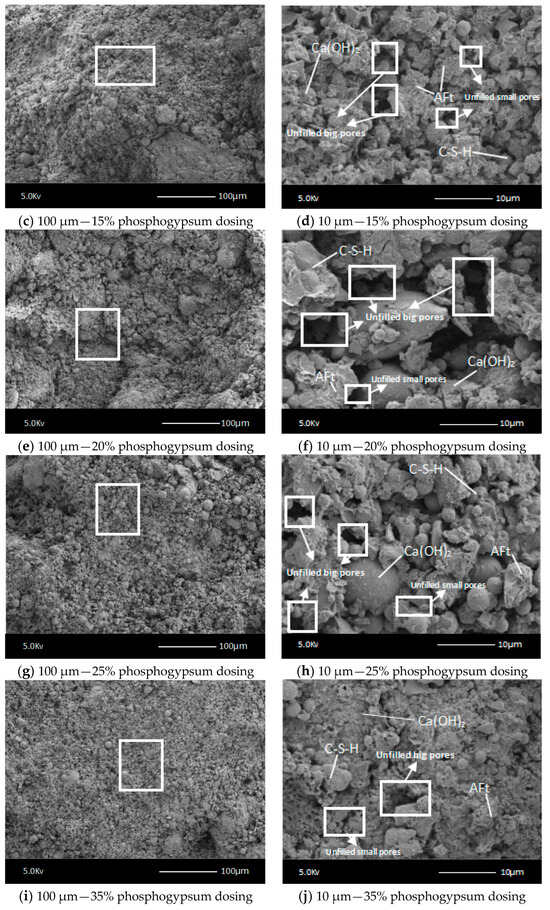 Figure 10, the surface of the test block without a phosphogypsum content exhibited numerous pores of varying sizes, calcium hydroxide crystals, and calcium silicate hydrate (C-S-H). This indicates that the combination of calcium oxide and blast furnace slag generates a significant amount of calcium silicate hydrate (C-S-H) and calcium hydroxide. Additionally, it effectively stimulates the activity of blast furnace slag. The test block with 15% phosphogypsum content produces some ettringite. Its internal structure is relatively dense with a smoother surface. There are more pores inside, along with noticeable incomplete penetration of microscopic cracks. A large quantity of ettringite and interwoven calcium silicate hydrate (C-S-H) constantly fill in voids, resulting in a denser internal structure for the specimen.