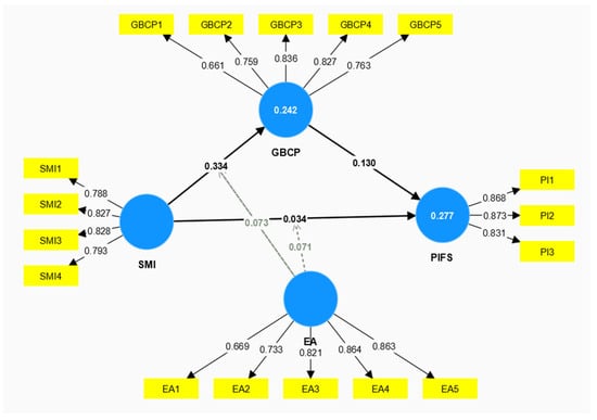 Table 6 presents the cross-loading values, which represent the strength of relationships between individual items and their intended constructs, as well as potential associations with other constructs. The interpretation involves examining the pattern of these cross-loadings to assess their discriminant validity. Each item should exhibit a higher correlation with its intended construct than with other constructs. In this study, the results indicate that items related to EA, GBCP, PISFS, and SMI normally align with their intended constructs. This pattern supports the discriminant validity of the constructs, suggesting that the measurement items effectively capture the distinct aspects of each construct.