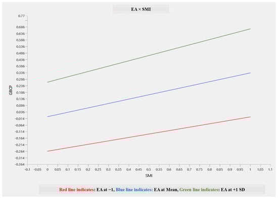 The heterotrait–monotrait (HTMT) ratio test results, as presented in Table 5, demonstrate discriminant validity among the key constructs in the research study. The HTMT ratios were calculated by comparing the correlations between different constructs (heterotrait correlations) with the average correlations within the same construct (monotrait correlations). For discriminant validity, the HTMT ratios should be considerably below 1.0, signifying that the correlations between distinct constructs are markedly lower than the average correlations within each construct. In this study, the HTMT ratios of 0.444 (EA-GBCP), 0.37 (PISFS-GBCP), and 0.303 (SMI-PISFS) are all below the important level, which means there is strong evidence for discriminant validity. These results imply that the correlations between different constructs are smaller than the average correlations within each construct, strengthening the measurement model and effectively distinguishing between EA, GBCP, PISFS, and SMI.