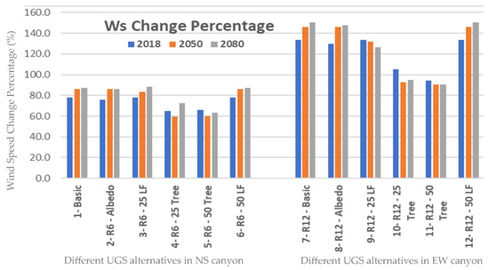 An ENVI-met simulation was then undertaken for the future climatic scenarios in 2050 and 2080, in order to detect the impact of the changing climate on pedestrians within both street orientations. Consequently, results were extracted from ENVI-met in the form of graphical illustrations and Excel files representing the data calculated by the Receptors within both canyons. An in-depth analysis is undertaken in order to explore the influence of each individual UGS alternative in the three climate scenarios to assess the most appropriate UGS alternative for each canyon orientation in each scenario. These results were further analyzed, compared, and discussed according to each PTC (Ws, RH, Ts, Ta, Tmrt, PET, PMV, and PPD). As illustrated in Figure 3, the change in wind speed (Ws) increases in EW to range between 90% and 140%, while for NS the Ws change ranges between 60% and 80%. Across all climate scenarios, placing more trees within canyons with higher Ws leads to a reduction in Ws, as expected.