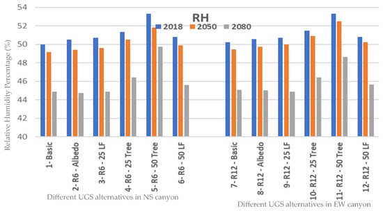 Relative humidity (RH) is constant across different canyons as indicated in Figure 4. However, it should be noted that 2018 had the highest RH, with 50% then declined by 2% in the 2050s and further declined by 8.8% in the 2080s, which indicates that summer seasons will become drier and hotter in the near future. Trees and LFs are the best alternatives for low RH, as they increase RH to compensate for the dry weather. Both LF percentages and trees with 25% had a similar RH percentage of increase while trees with 50% coverage had the highest RH across all climate scenarios with an increase of between 6% and 10% in RH compared to its base case in each climate scenario. Notably, the drier the climate becomes, the higher the increase in RH provided by trees or LF becomes. The increase in RH, especially with a high percentage of UGS 50% trees or 50% LF, may be due to evapotranspiration leading to increased RH in the air particularly within future climates in the 2050s and 2080s; this will help moderate the climate in summer as it becomes drier. Therefore, placing more trees in the canyon in future climatic scenarios is not only helpful for reducing the Ta, but also to increase RH and hence improve the overall thermal comfort levels.