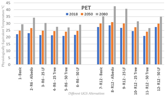 Figure 5 indicates that with future climate scenarios, PET increases at variable levels across both street canyon orientations. PET has increased in both NS and EW canyons, by 2.5 °C and 7.5 °C in 2050 and 2080, respectively. However, the air temperature increase is the same; the temperature in the EW canyon was 5 °C higher than for the NS canyon. This may indicate that the amount of global solar radiation (GSR) received by the EW canyon is higher than the amount received in the NS canyon. Since PET is the main factor to judge PTC in each year as it takes into consideration all thermal comfort factors (Ta, Tmrt, Ws, and RH), it is very important to compare PET in order to determine PTC in each climate scenario, as shown in Figure 5. The EW was higher in Ta and PET across all climate scenarios due to the exposure to longer hours of direct GSR, as the canyon has an EW orientation. PET in the EW canyon was higher than NS by 5.4 °C on average, which represents 23.7%, 21.2%, and 20% for 2018, 2050, and 2080, respectively. Even though the temperature difference between EW and NS decreases with time, it is worth mentioning that the average Ta is increasing with time which confirms that using UGS becomes an essential solution to mitigate impacts of climate change.