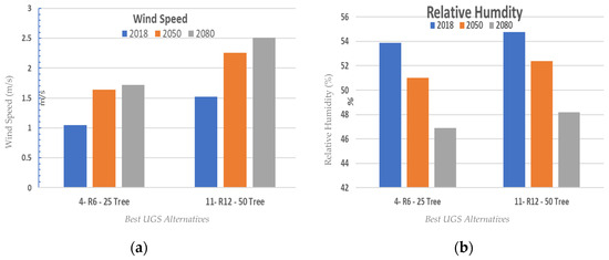 Figure 6a,b demonstrate that Ws benefited from the distribution of tree percentages across different canyons where NS naturally has lower Ws, so applying 25% would not significantly affect the Ws; hence, thermal comfort levels would still be within acceptable ranges. On the other hand, within EW, with higher Ws showing a higher thermal stress due to exposure to more solar radiation, the 50% trees option was the most appropriate alternative. Across different climate scenarios, Ws within NS was about 66%, 72%, and 68% of EW in 2018, 2050, and 2080, respectively. Overall, trees decrease Ws, yet they have improved thermal comfort due to their shading influence. On the other hand, RH decreased with time, yet trees increased the RH of the air by a small margin during dry summers. The increase in RH in EW has been found to be +0.87%, +1.34%, and +1.3% for 2018, 2050, and 2080, respectively. The Ws change percentage in Figure 6a also reflects an identical trend as the Ws graph in Figure 3.