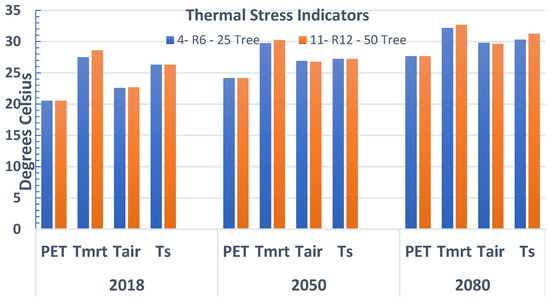 Based on the first stage of running simulations for different UGS within different climatic scenarios, the UGS alternative strategy was applied in each climate scenario to help recommend the most suitable and effective alternative for each canyon orientation within each scenario depending on the level of thermal improvement it affords to the pedestrians. Concerning the EW canyon, it was found that there was an urgent need for applying trees as a UGS alternative with 50% coverage within all climate scenarios, while within NS the 25% trees provided an appropriate solution to improve PTC within it. Thus, 50% of trees were applied in all years (2018, the 2050s, and the 2080s) within EW while, within NS, only 25% of trees were applied within those years. All climate scenarios were analyzed to investigate the outcome of the applied strategies. It has been found that for the most improved thermal comfort and climatic control of the 50% and 25% trees intervention, trees should not be aligned for more shade dispersed over the pavement; hence they improved thermal comfort across the canyon.