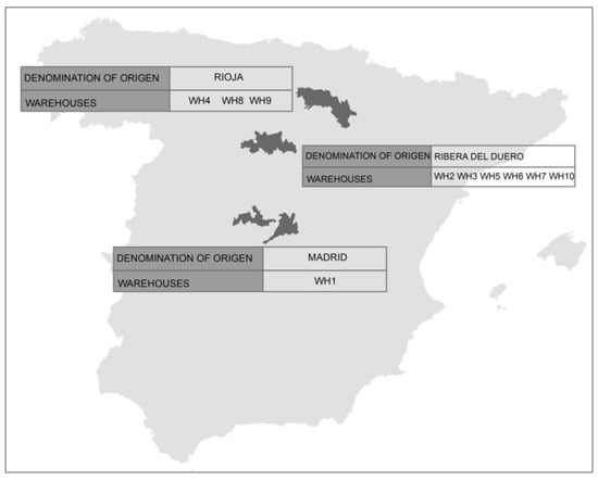 The selected wineries produced high-quality wines. They were scattered among referential producing regions, such as La Ribera del Duero, Rioja, and Madrid (Figure 1). In particular, the monitored warehouses belonged to the Alvarez Alfaro, Castillejo de Robledo, Emina, Hermanos Pascual Miguel, Legarís, Mauro, Moradas de San Martín, Murua, Resalte de Peñafiel, Ribera, and Valdelosfrailes wineries.