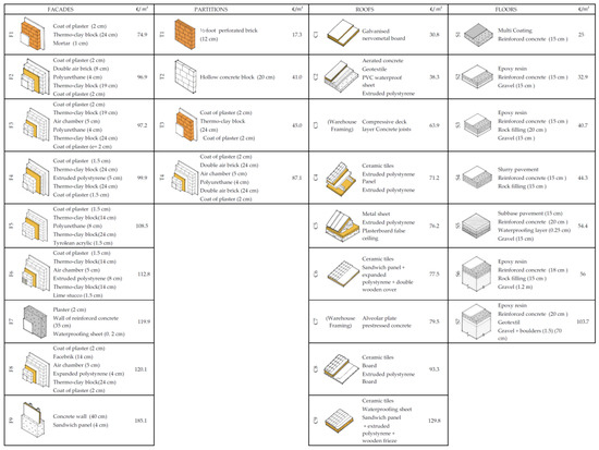 These construction solutions were grouped according to common features in the facades, floors, and roofs. Thus, five models of facades were identified (Table 1), and their costs varied between 75 EUR/m2 for the simplest enclosures composed of a rendered prefabricated element (27 cm) and 185 EUR/m2 for solutions with a greater cost that included concrete walls and sandwich panels with a thickness of 44 cm. However, the most commonly used enclosure, which had a width that ranged between 35 and 50 cm, consisted of two layers (exterior and interior) of brick or thermo-clay and an insulating element inside that could also include a chamber of air, with an average cost of 106 EUR/m2.