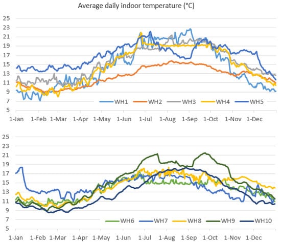 The least favorable performance was, once again, evident in WH1, where faster fluctuations in temperature (0.8 ± 0.7 °C/week) were caused by excessive ventilation. At certain times of the year, its weekly average temperature could experience variations of almost 4 °C (Figure 9). The flow rates of the climate control equipment and/or exterior ventilation might have compromised the potential stability of the warehouse.