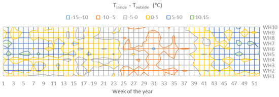 In spite of that, the indoor temperatures of WH2 and WH6 remained 5 to 10 degrees lower than the outdoor temperature for most of the summertime (weeks 25 to 37). In both cases, the combination of the facades and roofs provided thermal inertia through the incorporation of an insulation with a high thickness. In the remaining warehouses, the most critical period was the summertime, as the temperature difference went over 5 °C during the three hottest summer weeks (Figure 7).