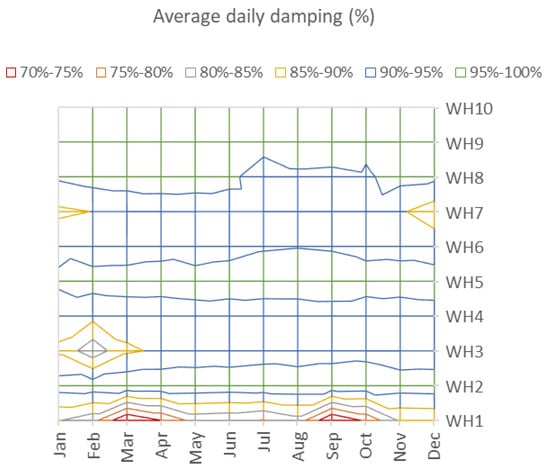 Every warehouse except WH1 showed a mean daily damping that was greater than 90%, reaching 99% in some cases; that is, the difference between the maximum and minimum temperatures recorded each day represented between 1% and 10% of the measurements outside. Specifically, the values were 79 ± 12% (WH1), 98 ± 1% (WH2), 91 ± 7% (WH3), 92 ± 3% (WH4), 98 ± 2% (WH5), 93 ± 4% (WH6), 91 ± 5% (WH7), 96 ± 5% (WH8), 98 ± 3% (WH9), and 99 ± 1% (WH10). In most of the warehouses, the capacity for dampening fluctuations in the outdoor temperature remained relatively constant throughout the year both with and without air conditioning (Figure 8). Only warehouse 1 exhibited variations that were significantly above the average. However, this lack of efficiency was due to the fact that it was frequently opened, which seemed to cause excessive ventilation. Therefore, daily damping stands as a potential indicator of the efficiency of warehouse construction solutions, contingent upon it not being compromised by excessive ventilation.