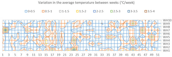 The thermal stability of the warehouses was also analyzed, and it was calculated as the difference between the average temperatures of two consecutive weeks. This indicator provided an insight into the rate at which the temperature changed indoors.