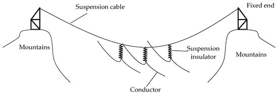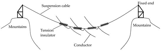 The first long-span CRS structure was reported in Cape Town, South Africa, in 2011: it was called the “invisible tower line”, and it provided better protection of the local landscape []. Cross-Rope Suspended systems with a Tension Insulator (CRSTI) (Figure 1) are currently the adopted type of CRS. For CRSTI, a Tension Insulator (TI) connects multiple sections of suspension cable and becomes a key member of the structure. Thus, the transmission line is directly supported by a suspension cable. Li [] established a finite element model for CRSTI, which was used to analyze the dynamic characteristics and study the wind-induced response. The horizontal displacements and tension force of the suspension cables of CRSTI increased with the increase in wind speed. These results provide a basis for the practical engineering design of CRSTI. Tu [] studied the corresponding vortex-induced vibration and the controlling methods of CRSTI by numerical simulation. However, due to the huge tension force, high tensional mechanical capacity is required for TI, which results in difficulty in construction and relatively poor economic efficiency. Therefore, a new type of CRS system is proposed, which is CRS with a Suspension Insulator (CRSSI) (Figure 2).
