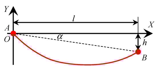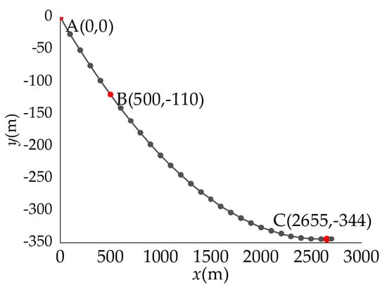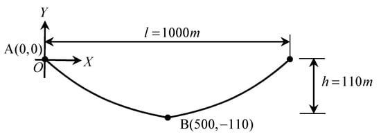 According to the actual engineering design parameters, the overall span of the suspension cable was 1000 m, and the lowest point of the design was 110 m. The coordinates of point were , and the coordinates of point were , which is shown in Figure 8. The length of the equivalent section of insulators and conductors was = 2175 m. For point , the coordinate was , which meant the span of the suspension cable was 1000 m, and the lowest of the suspension cable was −110 m. The numerical simulation showed that the requirements were satisfied when and . A diagram of the numerical simulation example is shown in Figure 9. Thus, it was calculated that .