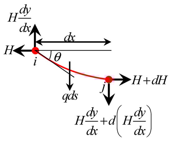 Both ends of the element were subjected to tension along the tangential direction, which was decomposed into horizontal and vertical directions, respectively. Moreover, the element was subjected to distributed loads caused by its self-weight. The equilibrium equations of the element are as follows: