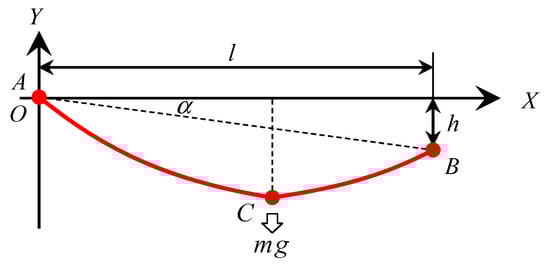 In long-span CRSSI, the expression for the cable differed from the above calculation due to the additional loading caused by SI and conductors. For simplification, additional concentrated force was set at the lowest point of the catenary, and the cable was symmetrical in shape. The demonstration of loading on cable is shown in Figure 5, where m denotes the sum of the mass of conductors and the mass of the insulator. In Figure 5, point A denotes the left end, point B denotes the right end, and point C denotes the lowest point.