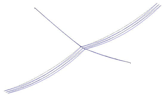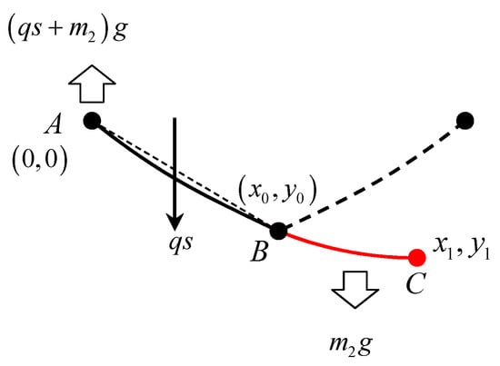 According to the differential equations of cable mechanics in the above chapter, despite the additional loading from the conductor and the overhanging insulator, the cable between the fixed end and SI kept the original shape of the catenary. Therefore, in order to derive the shape formula of cable considering the concentrated force, half of the mass of conductors and insulator, , was transformed into an equivalent cable segment with length x, as shown in Figure 6. Point A denotes the fixed end. Point B denotes the lowest end of the cable and the starting point of the equivalent cable. Point C denotes the end of the equivalent cable. The dashed line denotes the symmetric part of the cable from the fixed end, , to the hanging point, . The red line segment from B to C denotes the equivalent cable for the mass of conductors and the insulator. Point denotes the virtual lowest point of the equivalent catenary. Accordingly, , , and were located in the same catenary.