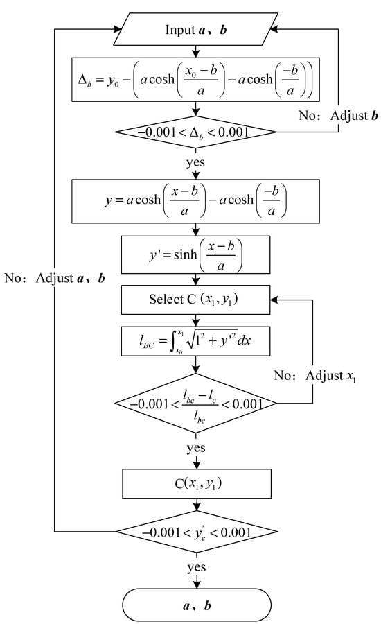 The values of and met the requirements when Equation (27) was satisfied. If not, the value of and were changed to recalculate. This process was continued until the function of the suspension cable was determined. The process diagram is shown in Figure 7. The length of section AB of the cable can be calculated according to the determined formula and Equation (25); that is, the actual length of the project after the function was determined.