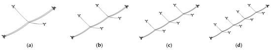 FE models of long-span CRSSI with multiple spans of conductors: (a) 2 spans, (b) 3 spans, (c) 4 spans, (d) 5 spans.